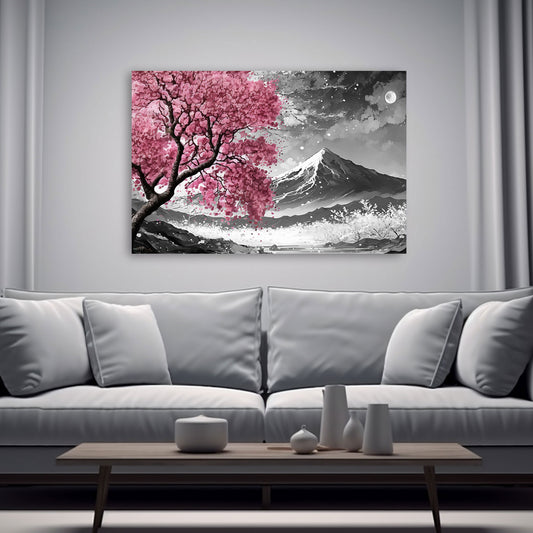 Pinker Baum in schwarz weiß Landschaft Wandbild Kunstwerk