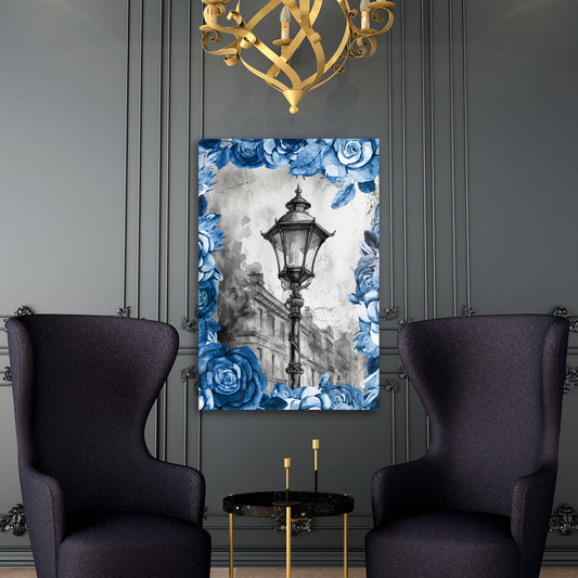 Straßenlampe schwarz weiß mit blauen Blumenrahmen Wandbild Kunstwerk