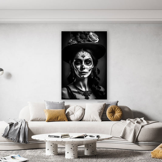 La Calavera Catrina im Spitzenkleid schwarz weiß Wandbild Kunstwerk