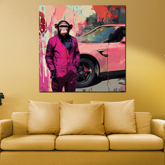 Pop Art Affe im Anzug vor Auto bunt Wandbild Kunstwerk