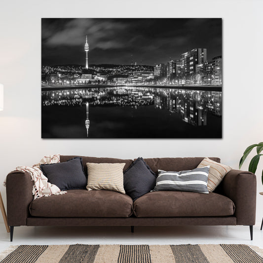 Fernsehturm Stuttgart Stadtlandschaft nachts schwarz weiß Wandbild