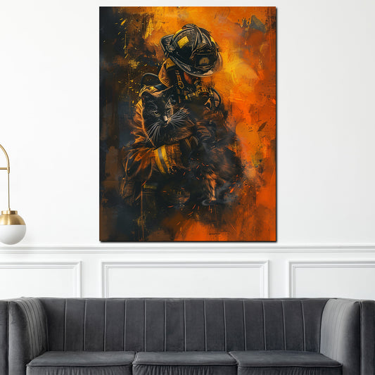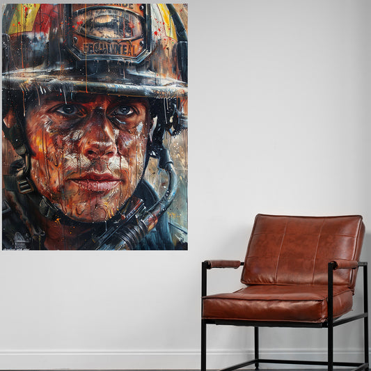 Abstrakt charismatischer Feuerwehrmann im Einsatz Wandbild Kunstwerk