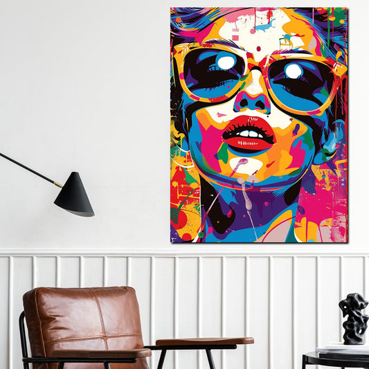 Abstrakt stilvolle Frau mit Brille Pop Art Wandbild Kunstwerk