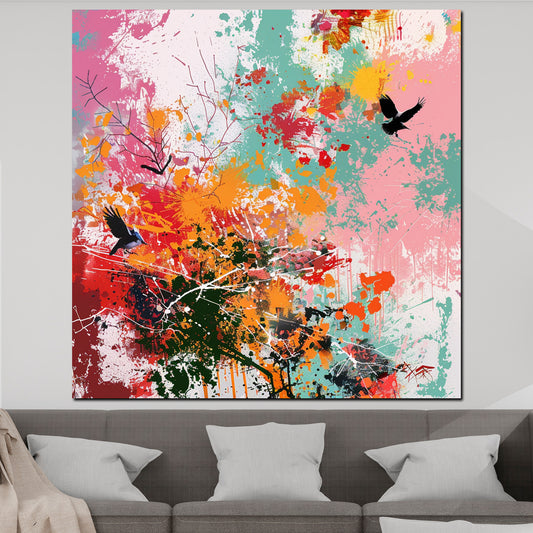 Farbenfroh mit fliegenden Vögeln Wandbild Kunstwerk