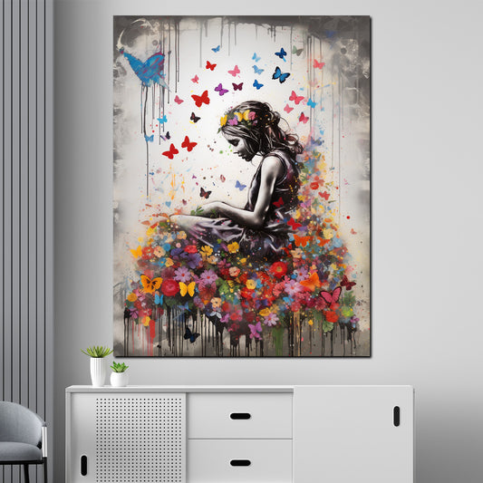 Street Art Mädchen mit Blumen und Schmetterlingen Wandbild Kunstwerk