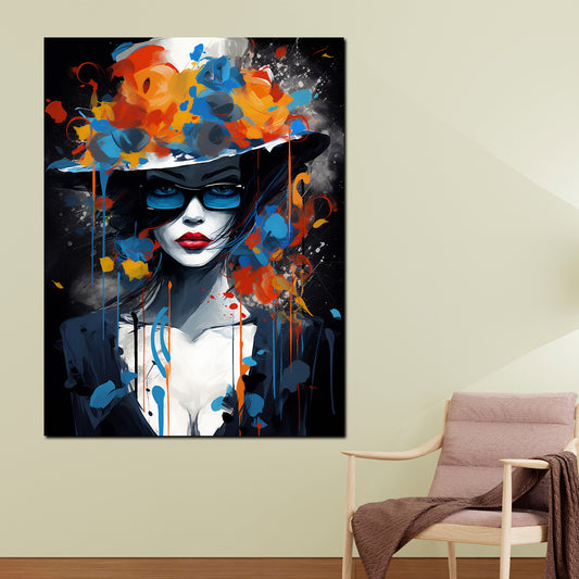 Mysteriöse Frau mit Brille und Blumenhut Wandbild Kunstwerk