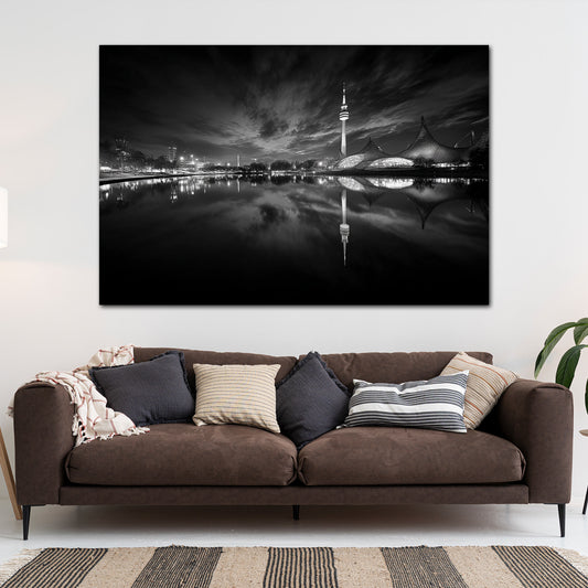 Olympiaturm München Panorama Spiegelung schwarz weiß Wandbild