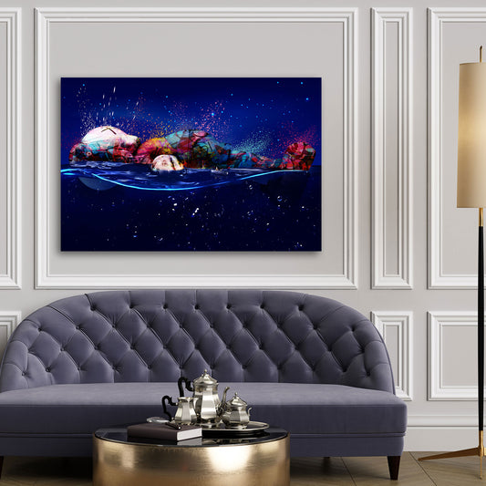Figur in Pop Art und Graffiti mit Wasserlandschaft Wandbild Kunstwerk
