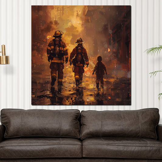 Abstrakt Feuerwehrmänner im Einsatz mit Kind Wandbild Kunstwerk