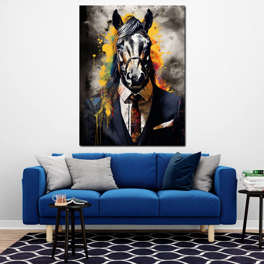 Pferd im blauen Anzug frontal Pop Art Wandbild Kunstwerk