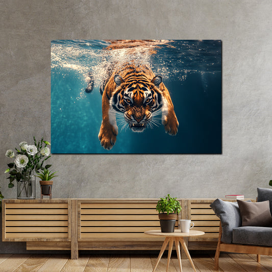 Tiger beim Eintauchen ins Wasser Energie Natur modern Wandbild Kunstwerk