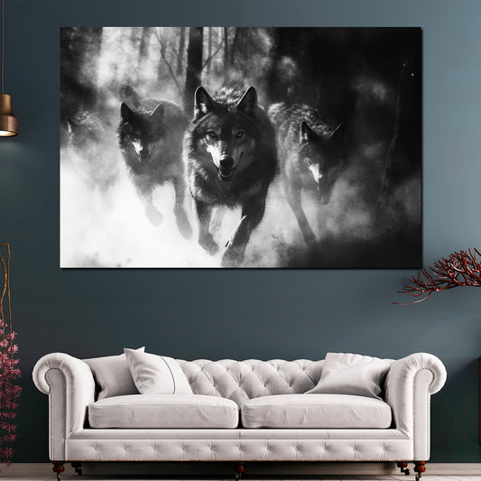 Wolfsrudel im Lauf düsterer Wald schwarz weiß Wandbild
