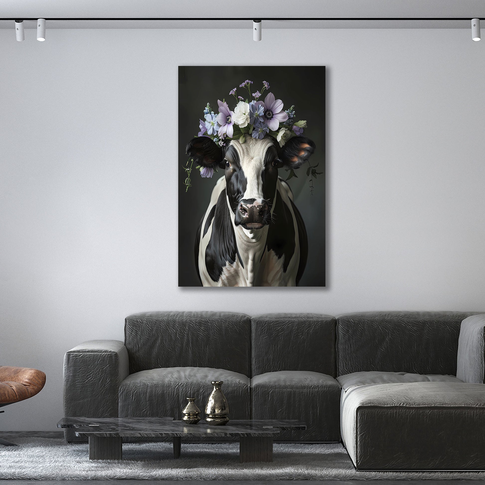 Bildschöne Kuh schwarz weiß mit Blumenkranz Wandbild