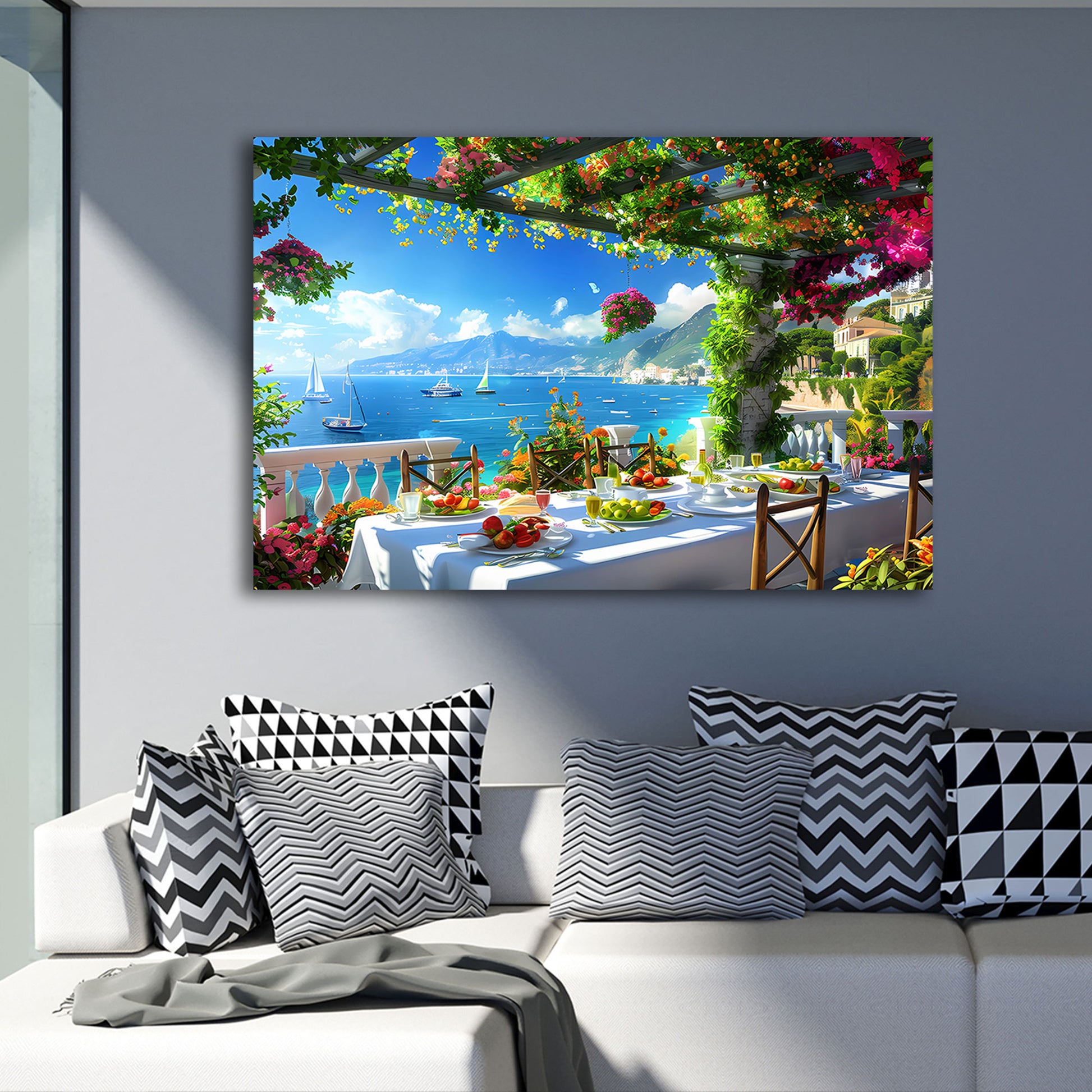 Italien Toscana mediterrane Landschaft Blumen und Segelboote Wandbild