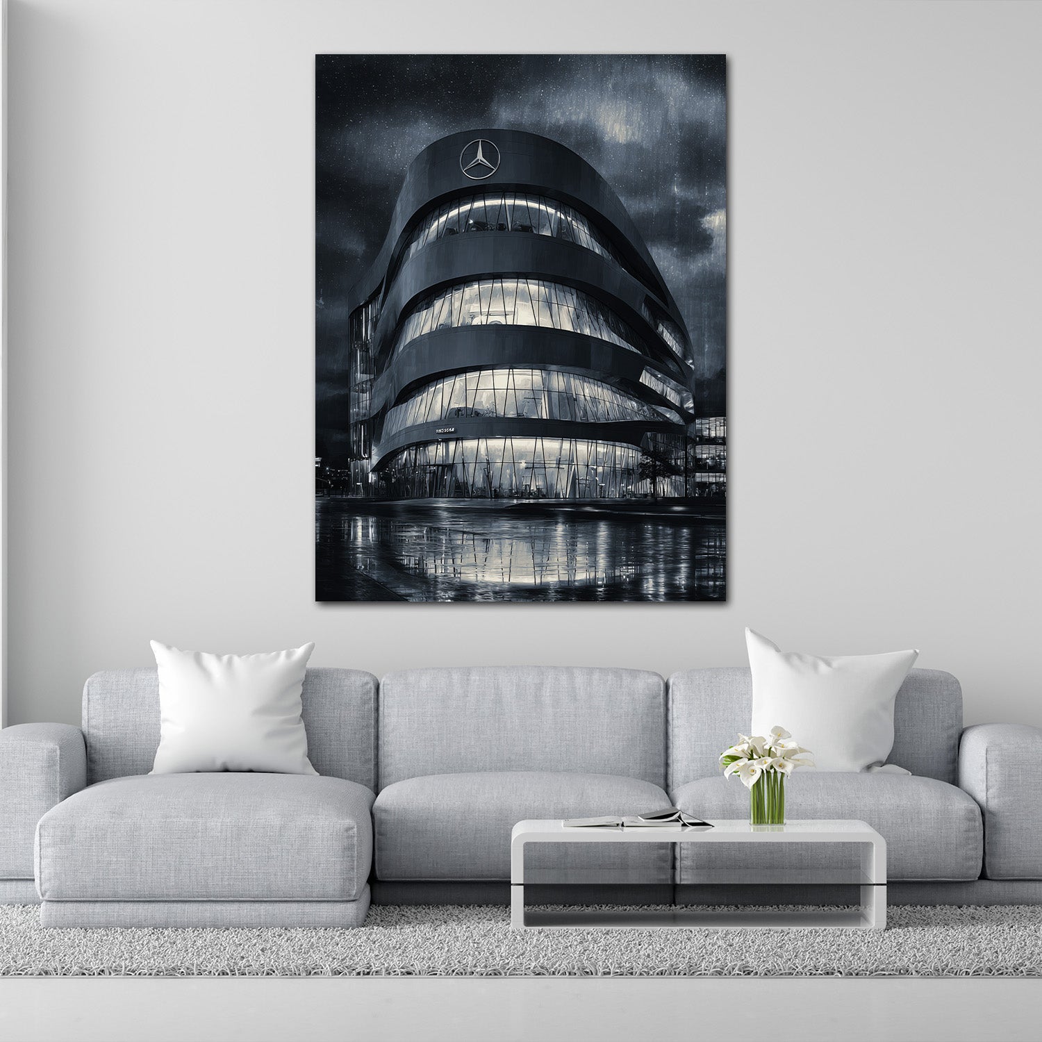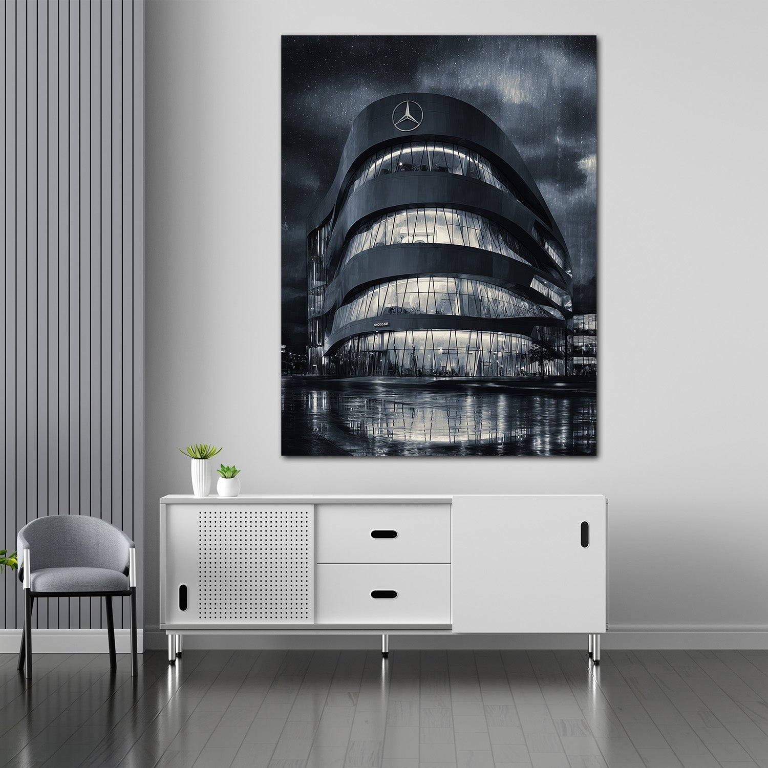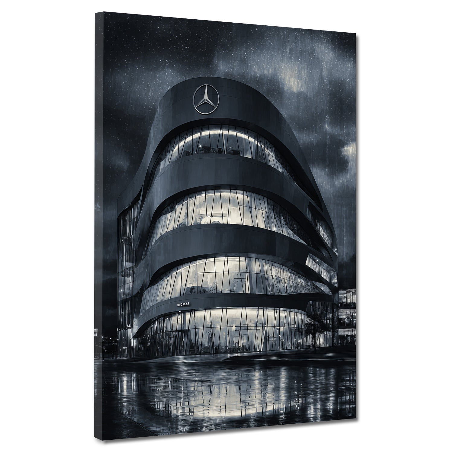 Mercedes Bau Stuttgart Nachtaufnahme Regen schwarz weiß Wandbild