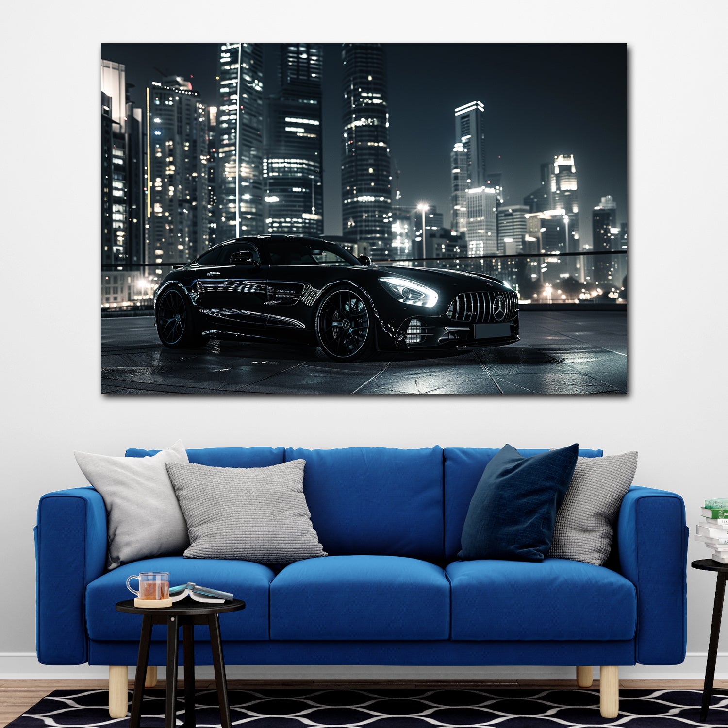 Schwarzer Sportwagen vor moderner Großstadt Wandbild