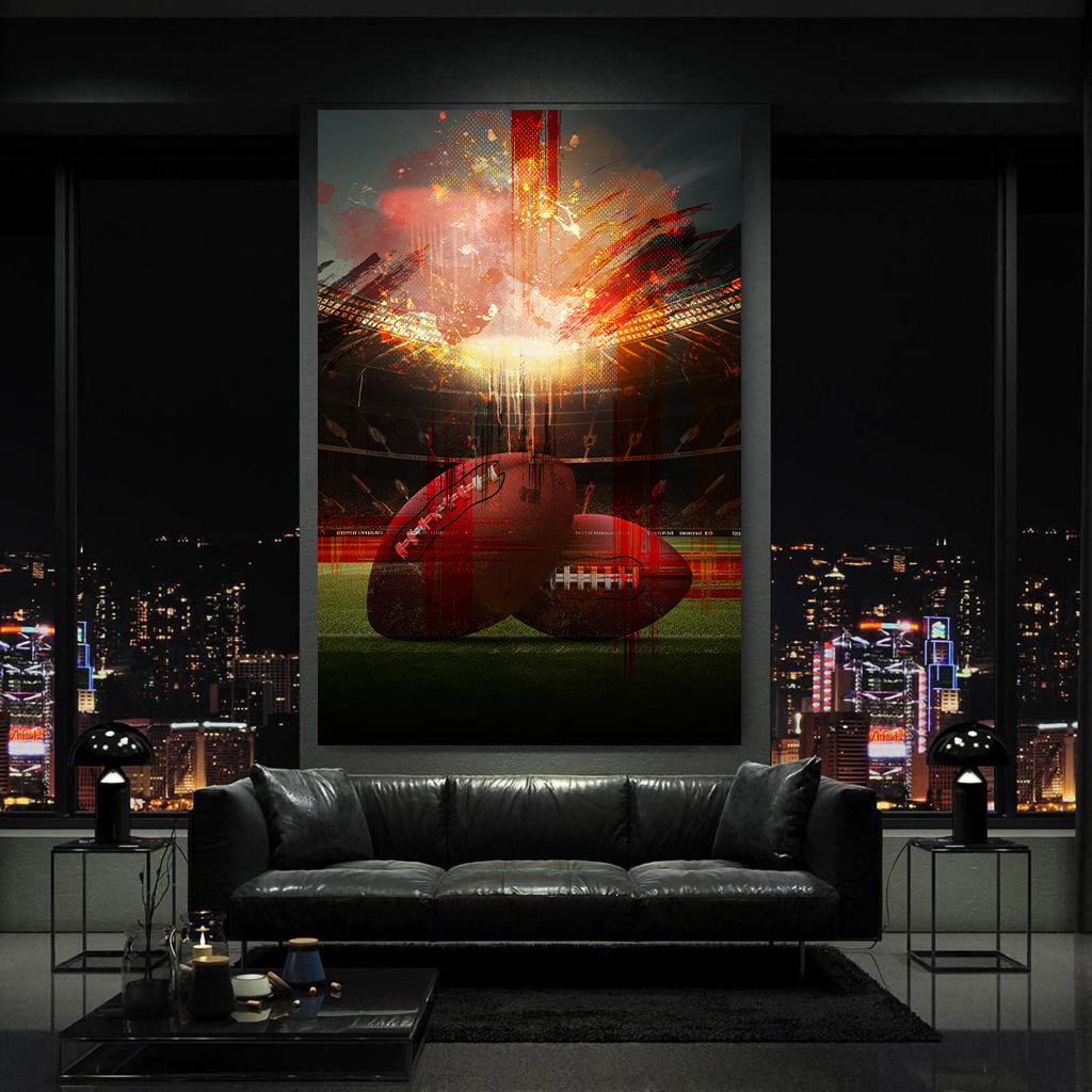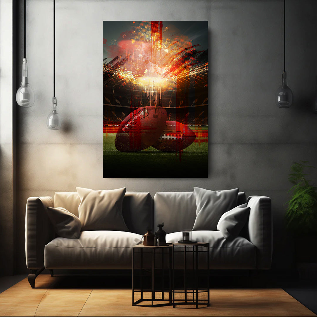 Footballs im Stadion mit dynamischen Licht- und Explosionseffekten Wandbild Kunstwerk