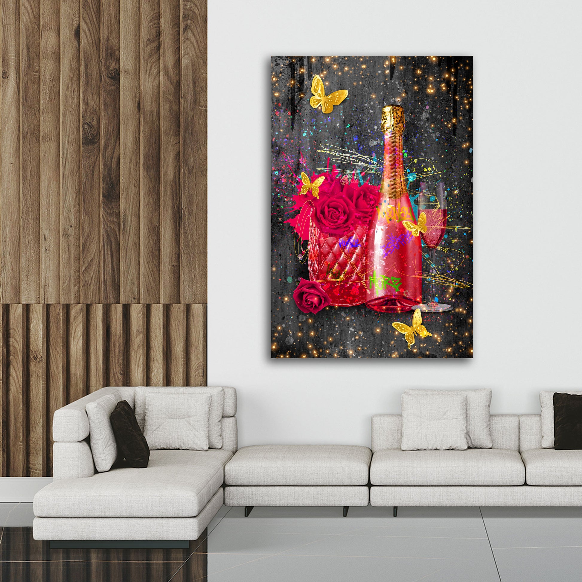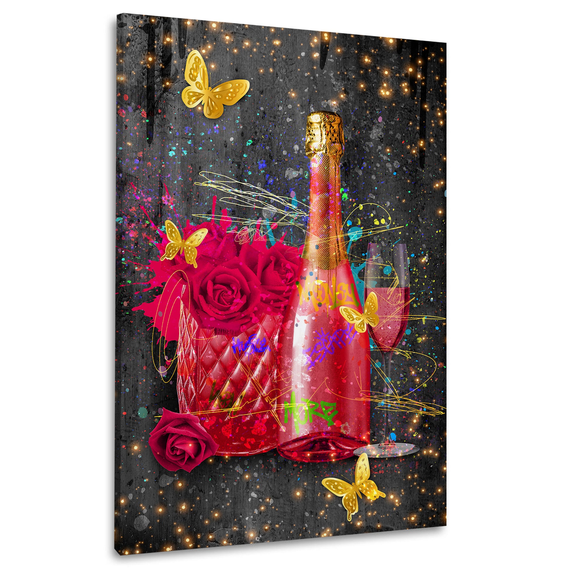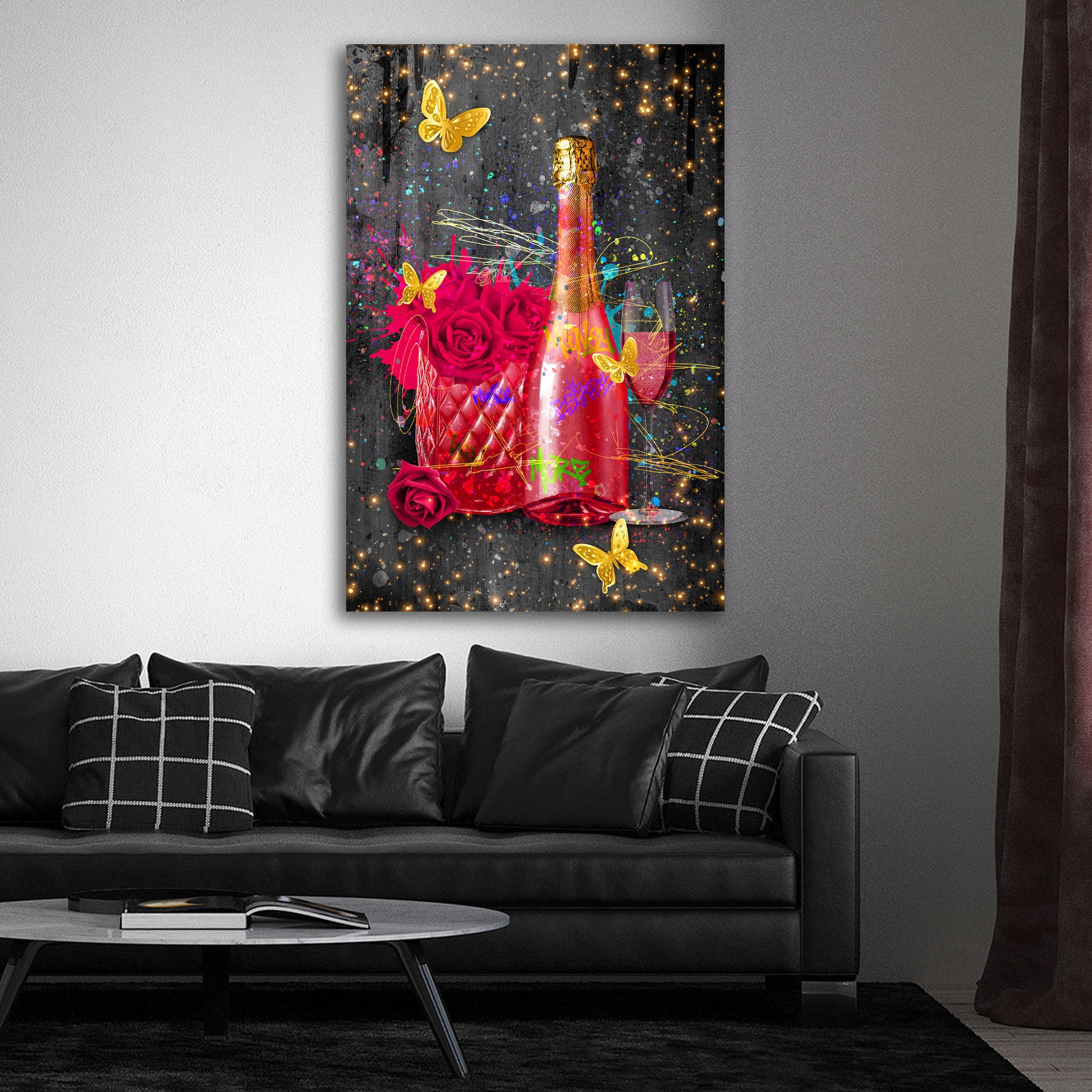 Pop Art Flasche mit Blumen und Schmetterlingen Wandbild Kunstwerk
