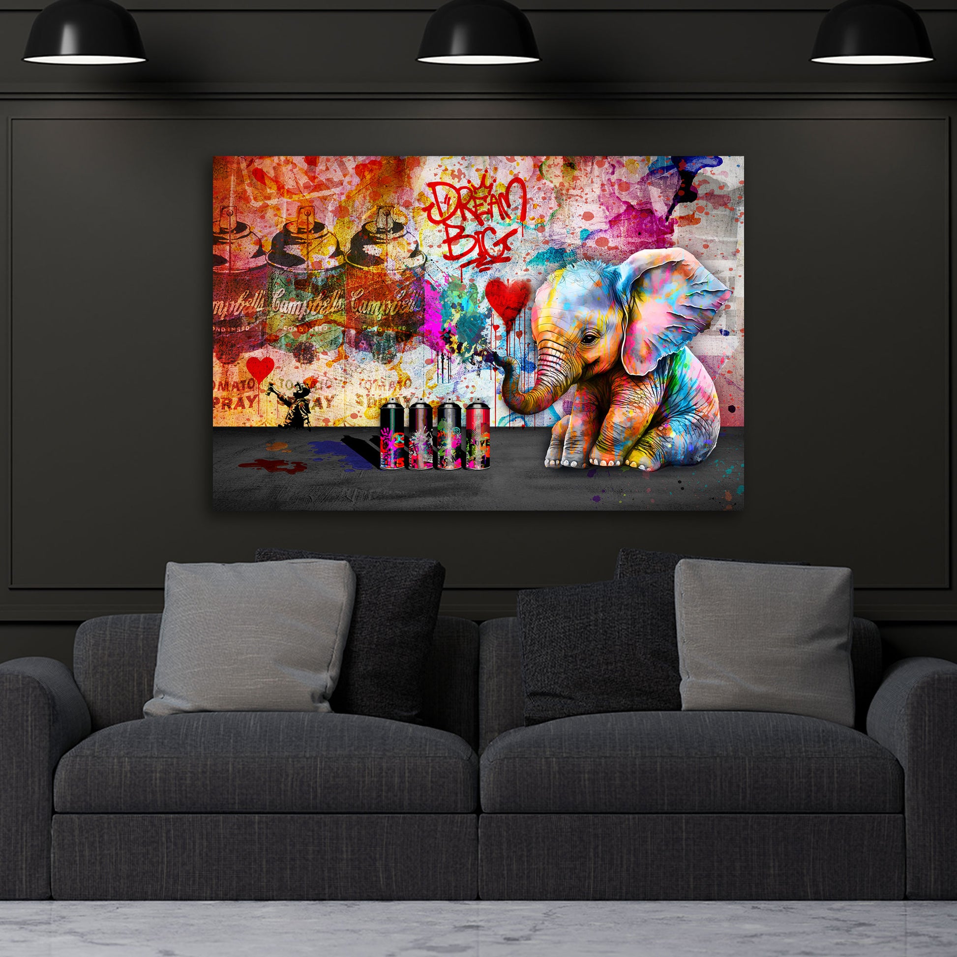 Street Art Elefant Baby mit Spraydosen Graffiti Style Wandbild Kunstwerk