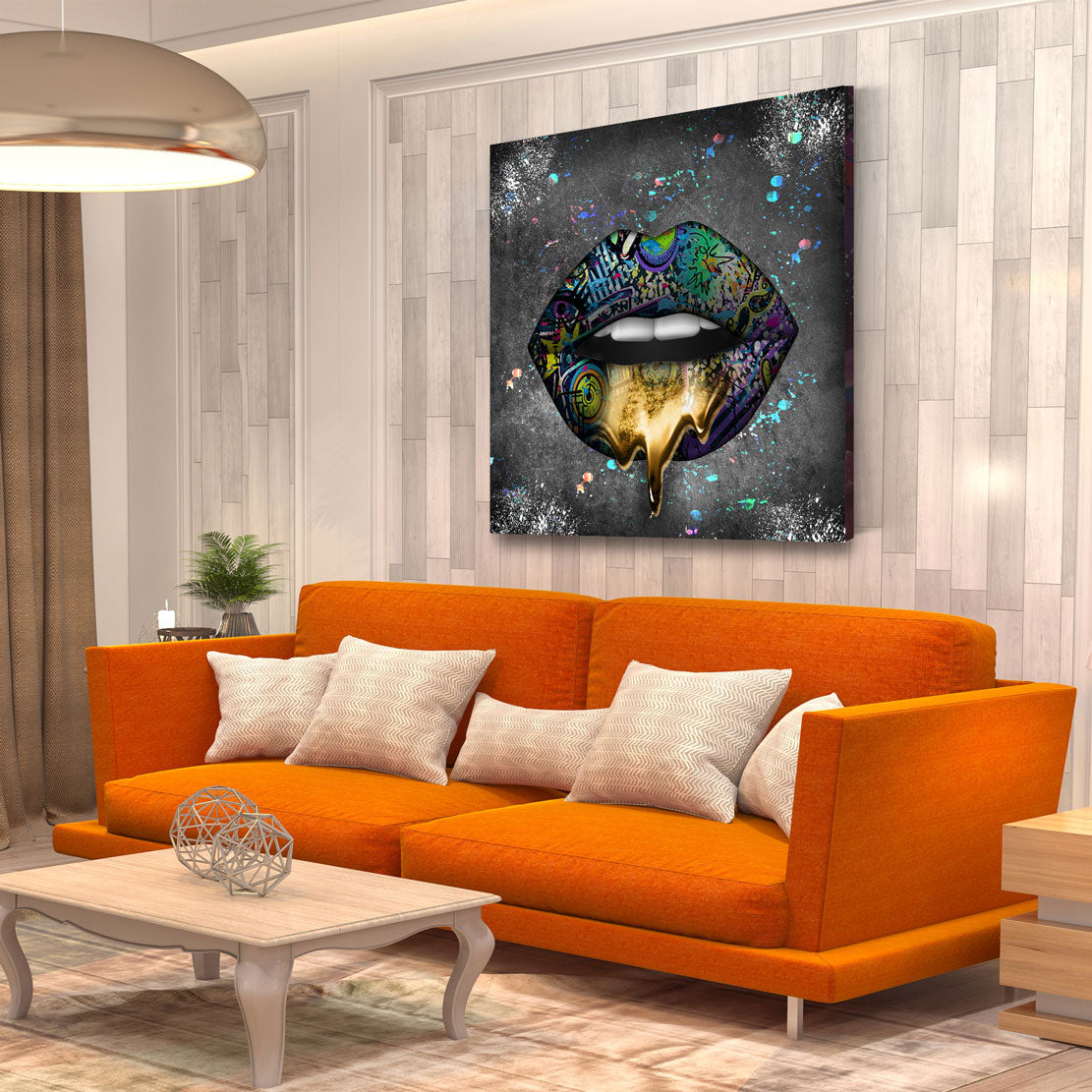 Street Art Lippen Gold Tropfen Wandbild Kunstwerk